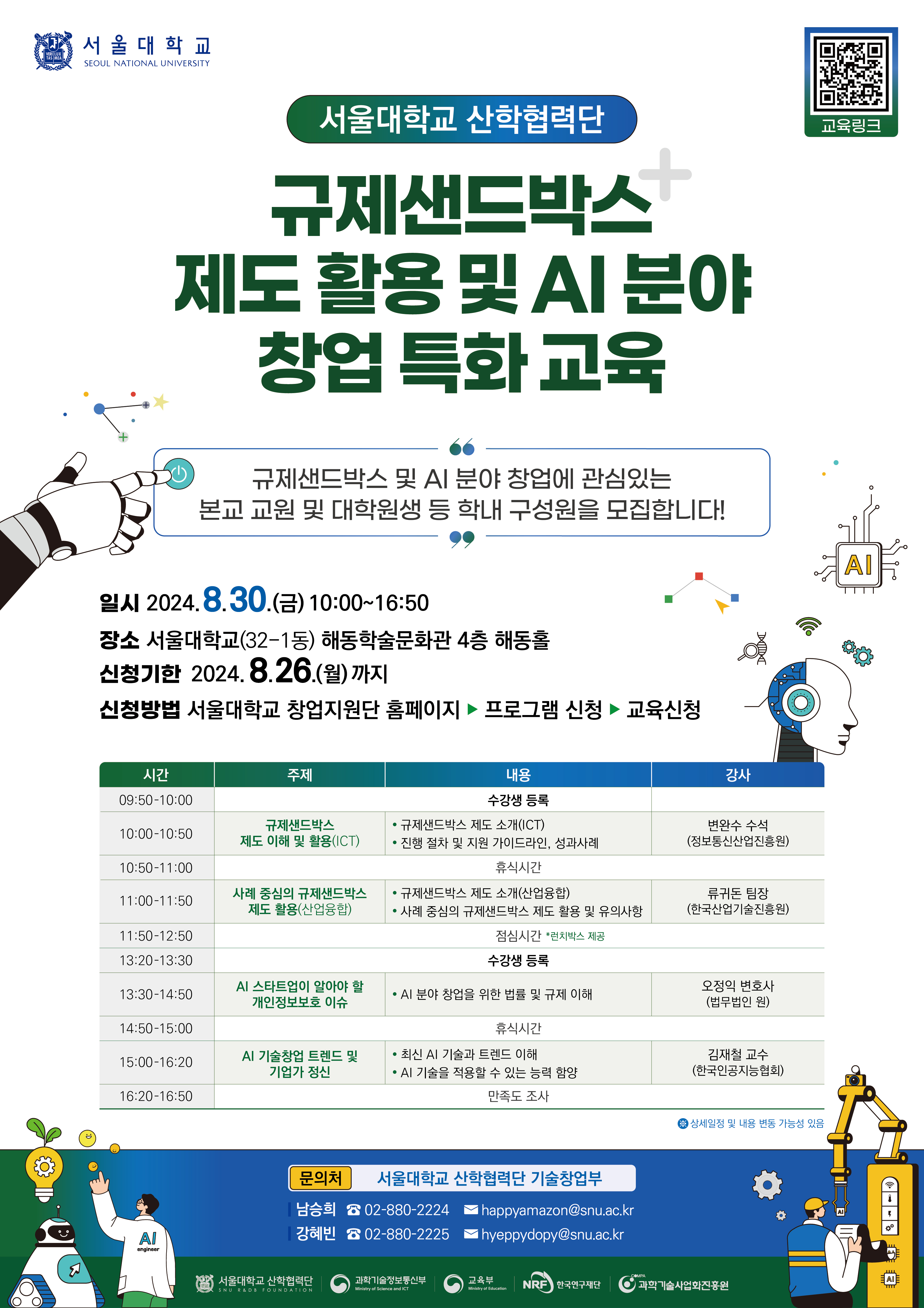 본교에서 수행 중인 교육부·과기정통부 지원의 2024년도 「실험실 특화형 창업선도대학」 사업 관련, '규제샌드박스 제도 활용 및 AI 분야 창업 특화 교육'의 교육생 모집을 위해 붙임과 같이 홍보 자료를 송부 드리오니, 관심있는 교내 구성원들께서는 참여해 주시기 바랍니다.