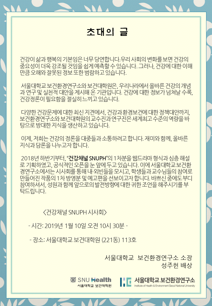 [소식]유튜브 건강채널 SNUPH의 스타가 되실 분을 모집합니다. (모집기한 연장: ~10/12(금))