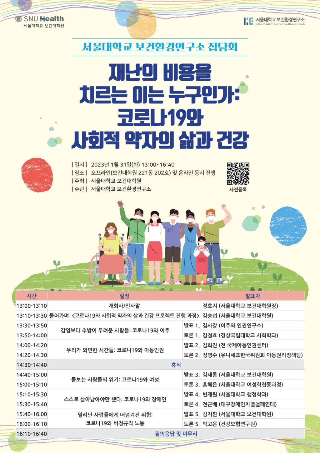 서울대학교 보건환경연구소 잡담회 “재난의 비용을 치르는 이는 누구인가: 코로나19와 사회적 약자의 삶과 건강" 포럼
