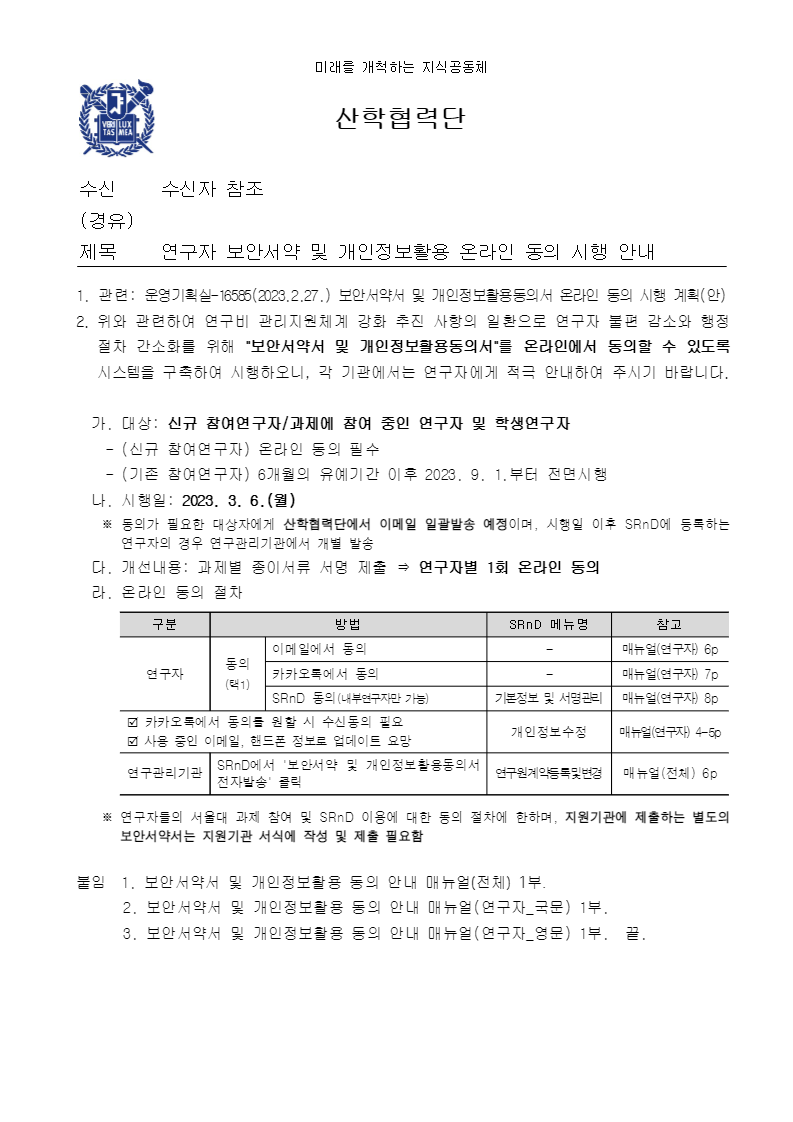 연구자 보안서약 및 개인정보활용 온라인 동의 시행 안내