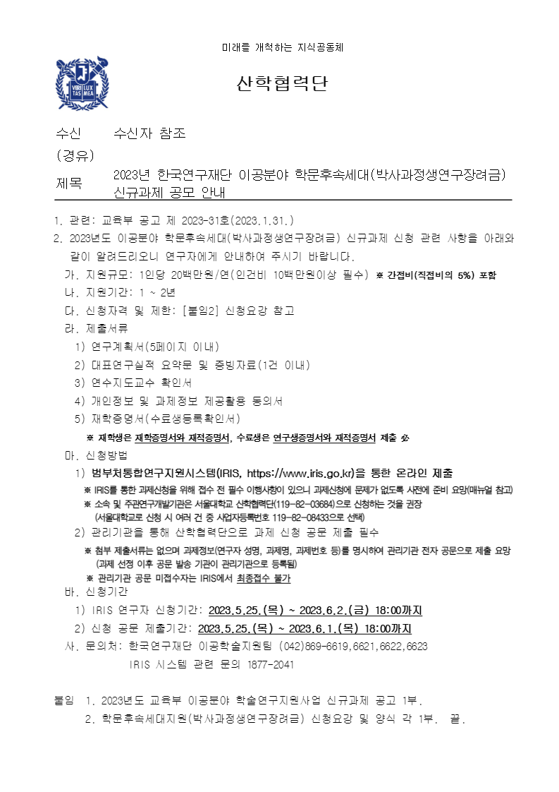 2023년 한국연구재단 이공분야 학문후속세대(박사과정생연구장려금) 신규과제 공모 안내