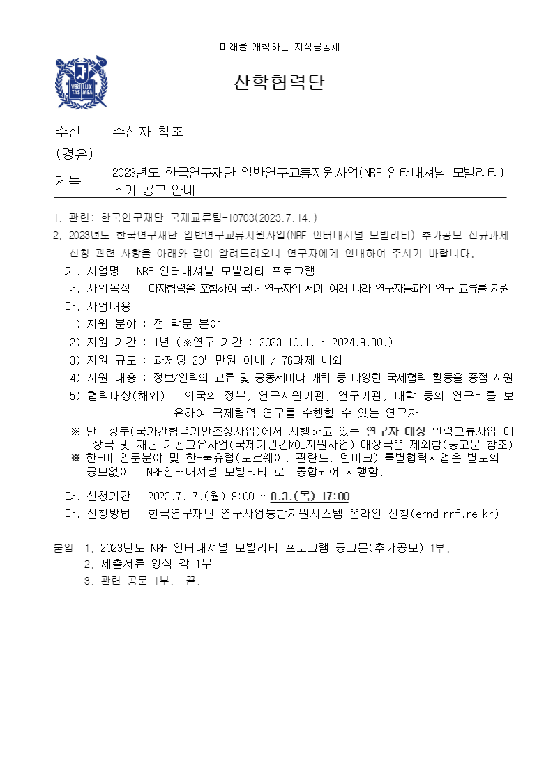 2023년도 한국연구재단 일반연구교류지원사업(NRF 인터내셔널 모빌리티) 추가 공모 안내