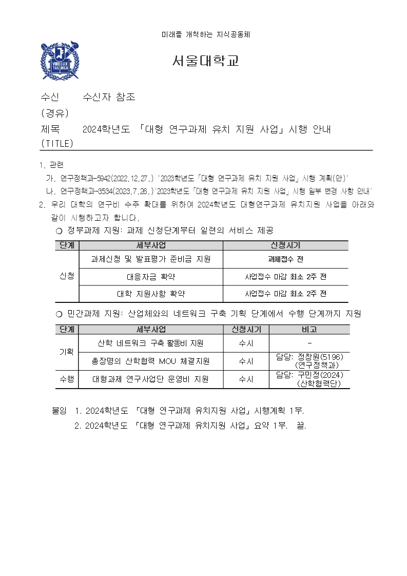 2024학년도 「대형 연구과제 유치 지원 사업」시행 안내
